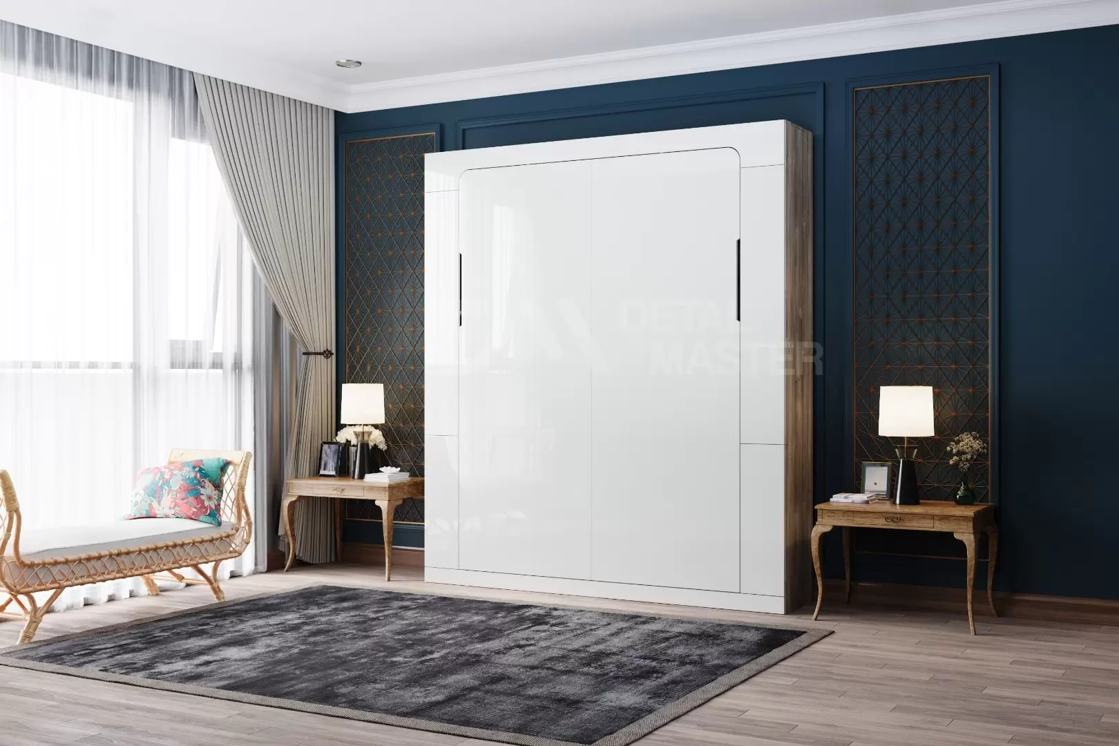 Фасад шкаф-кровати выполнен из МДФ глянец белого цвета, со сглаженными краями. Что позволит обезопасить вас от ударов при ходьбе возле кровати в разложенном положении и добавит изысканность модели шкаф-кровати. Корпус выполнен из ЛДСП декор Намибия. По бокам модель оснащена полками для хранения вещей с закрывающимися дверцами.